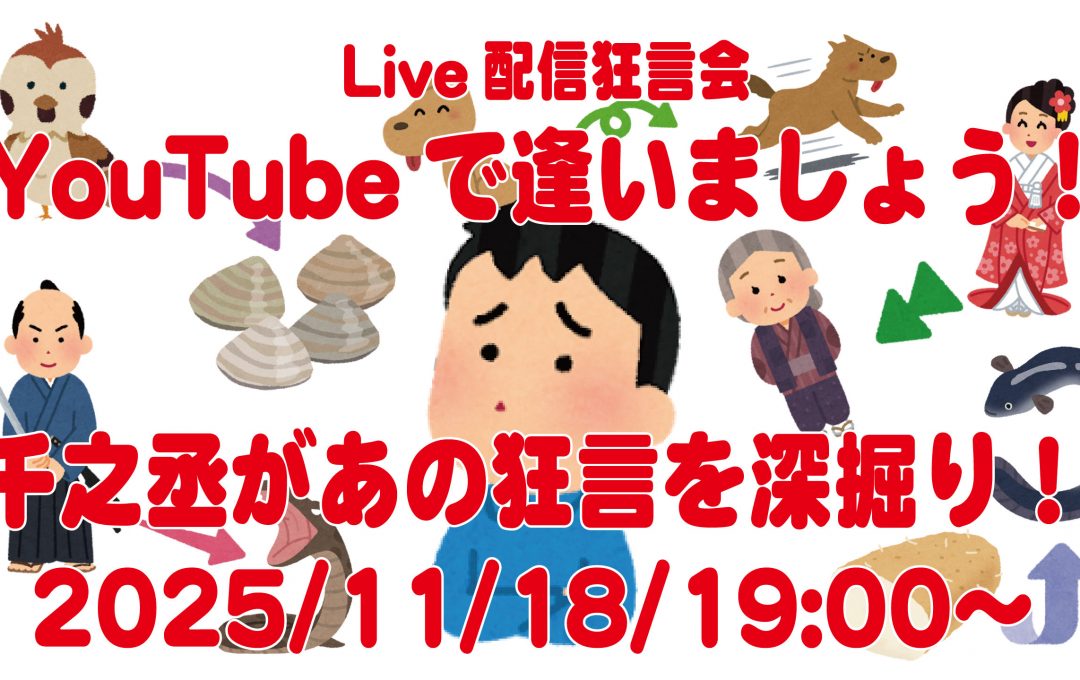 SOJAブログ 2025年11月14日 YouTubeで逢いましょう!ライブ配信は11/18(火)、19:00〜! リニューアルしたYouTubeで逢いましょう‼️は、今回はあの?狂言について千之丞さんと深掘り⁉️していきます! そして禁断の古典作品の再演出?再構成?にも踏み込んで話します笑 逸平 【ライブ配信】 YouTubeで逢いましょう! ~千之丞があの狂言を深掘り!〜 2025/11/18/19:00〜 クラブSOJAチャンネル 続きを読む