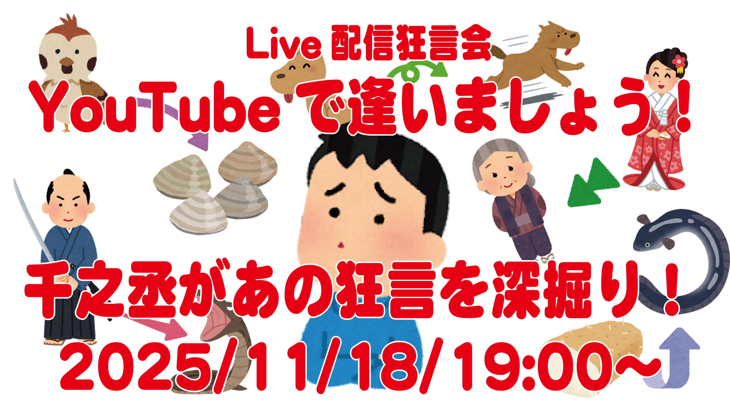 SOJAブログ 2025年11月14日 YouTubeで逢いましょう!ライブ配信は11/18(火)、19:00〜! リニューアルしたYouTubeで逢いましょう‼️は、今回はあの?狂言について千之丞さんと深掘り⁉️していきます! そして禁断の古典作品の再演出?再構成?にも踏み込んで話します笑 逸平 【ライブ配信】 YouTubeで逢いましょう! ~千之丞があの狂言を深掘り!〜 2025/11/18/19:00〜 クラブSOJAチャンネル