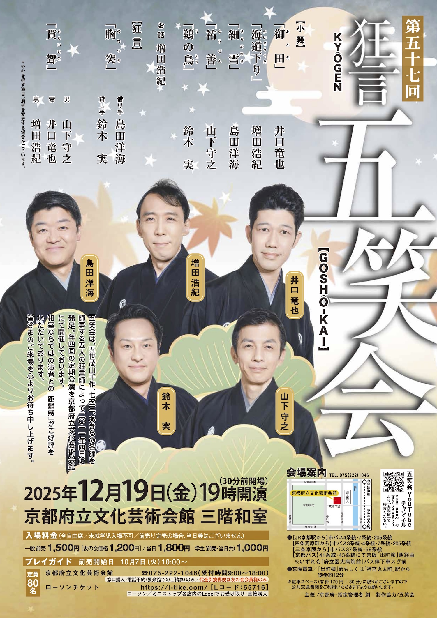 大蔵流狂言 茂山千五郎家の狂言師 島田洋海、増田浩紀、井口竜也、鈴木実、山下守之の5名が日頃の修行の成果を披露します。